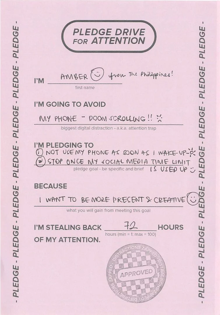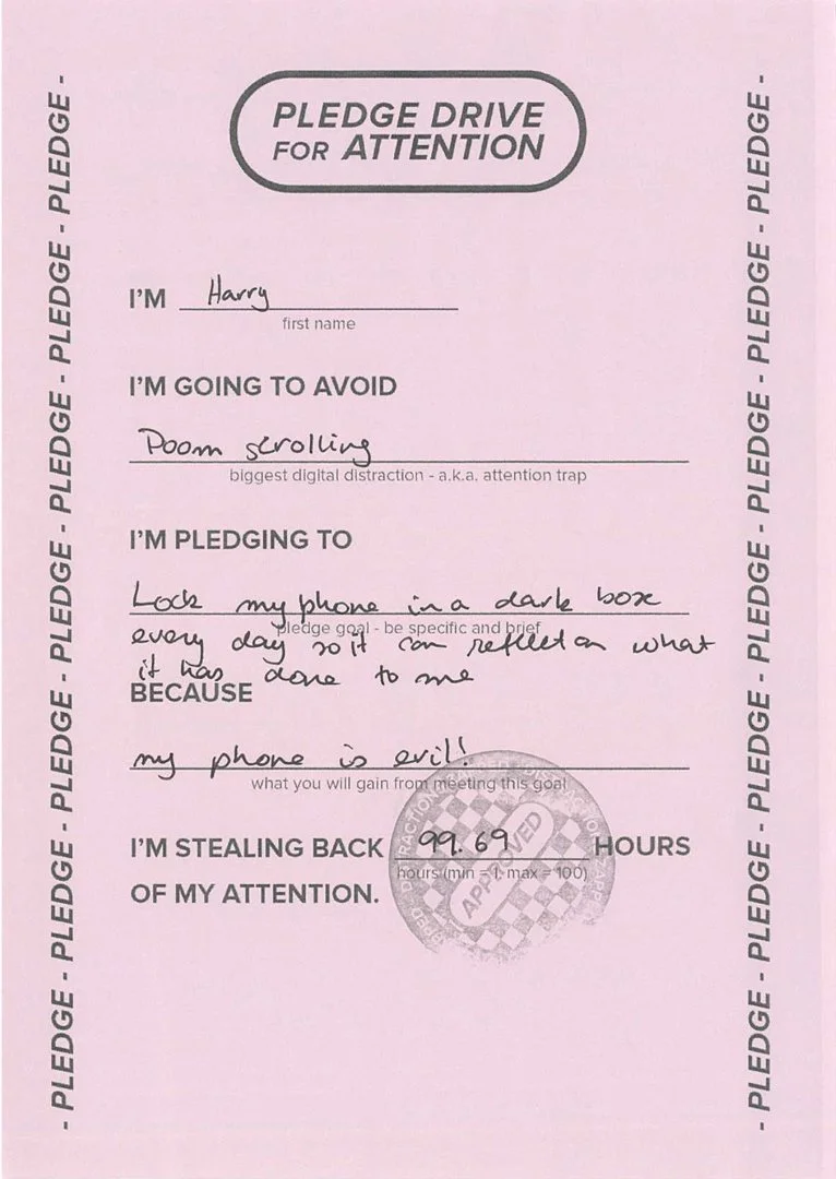 This is the ambition behind Pledge Drive for Attention: to steal back time, together. Whether it’s a better night’s sleep, a new skill, or a moment of stillness, each commitment is a step toward a different kind of digital future – one shaped not by endless scrolling, but by intention.