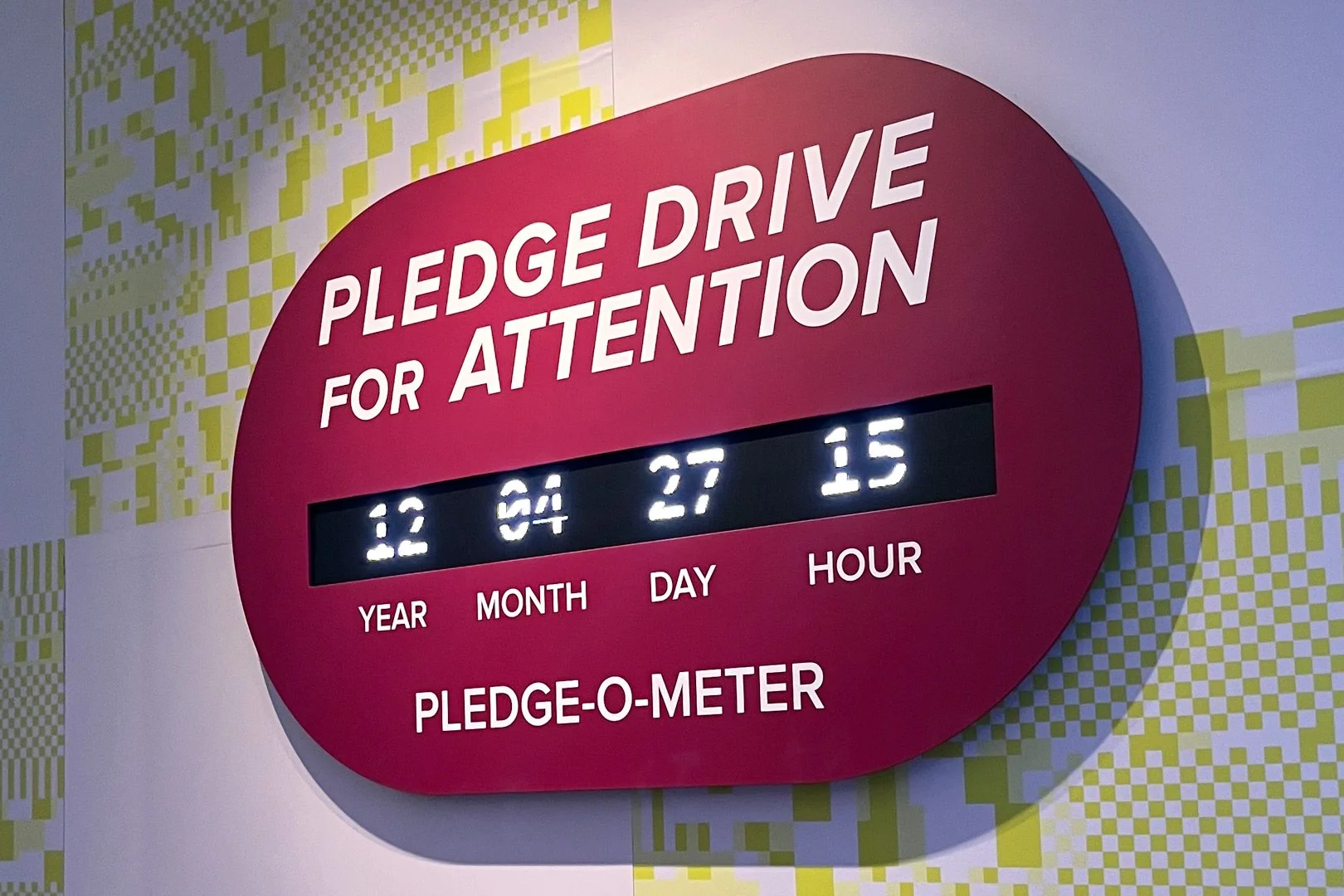 As part of DISTRACTION, artist Laura Allcorn invites visitors to take part in a collective experiment: the world’s first Pledge Drive for Attention. At a desk designed for reflection (and a little bit of satire), participants commit to breaking habits that quietly shape their days. And it’s working: the Pledge-O-Meter has already reached 12 years, 4 months, 27 days and 15 hours of reclaimed attention – and it’s still growing, with every new promise added.
